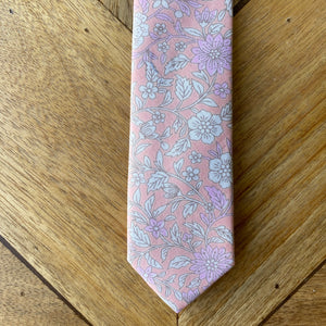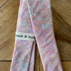 Our Eli Boy Tie is a sweet pink floral. This tie features pink and cream flowers. Perfect for any springtime celebration.